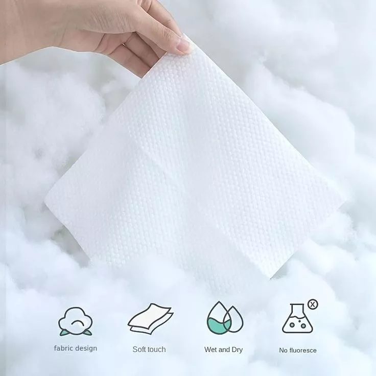 Luonnollinen kasvipohjainen kudottu kangas: 80 gsm biologisesti hajoava kudottu kangas, joka on valmistettu FSC-sertifioidusta puulassasta, herkillä kuiduilla, kuten PET-fluffilla ja vetolujuudella 40 n/5 cm: iin, jota ei ole helppo rikkoa tai jättää hiutaleita pyyhkeessä.